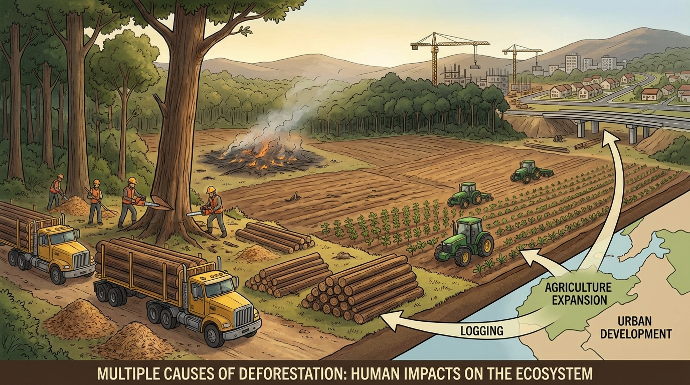 主な原因は伐採、火災、土地転用など多岐にわたる